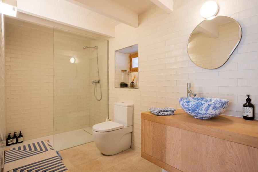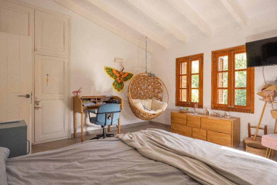 Inside, the house comprises five spacious bedrooms and four beautifully designed bathrooms, as well as a dedicated office perfectly suited to remote working. The modern kitchen, designed and installed by the renowned local company Estils i Formes, features a central island and marble worktops, combining sleek design with practical functionality, and includes a large adjacent pantry. A separate dining room provides the ideal setting for family meals and entertaining guests, while the cosy living area opens directly onto a generous covered terrace, perfect for outdoor dining or simply relaxing in the shade.