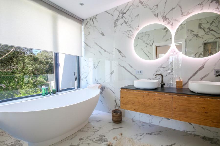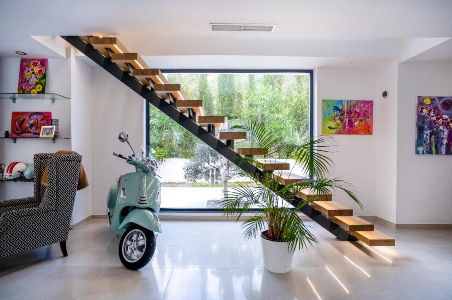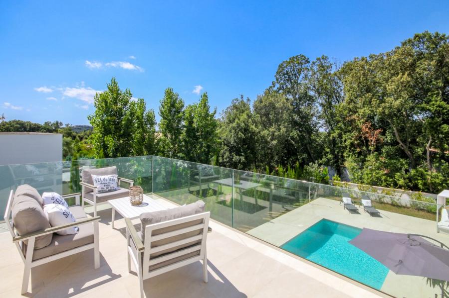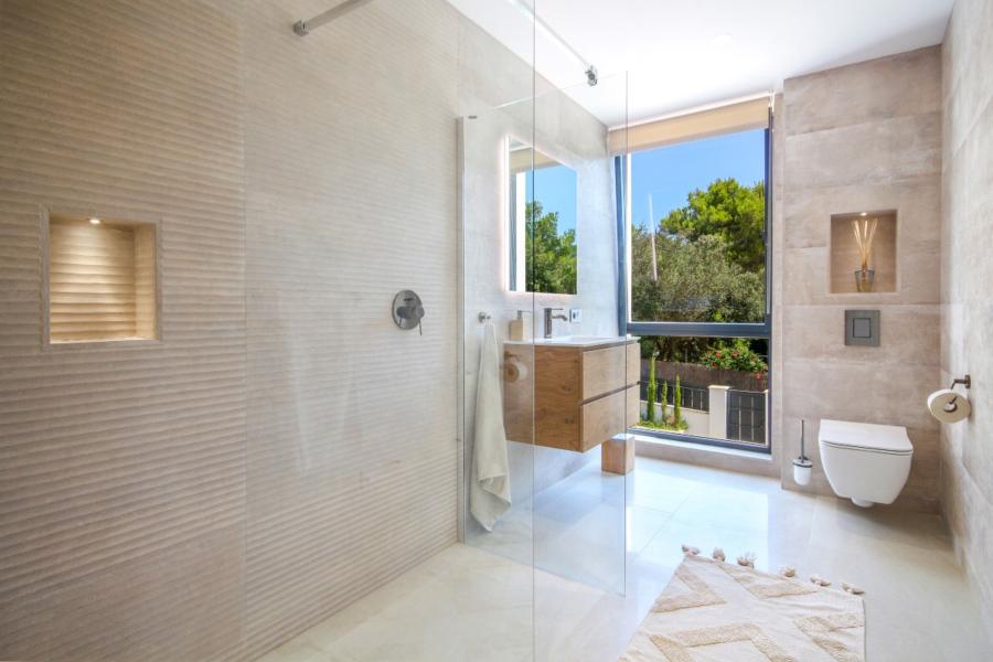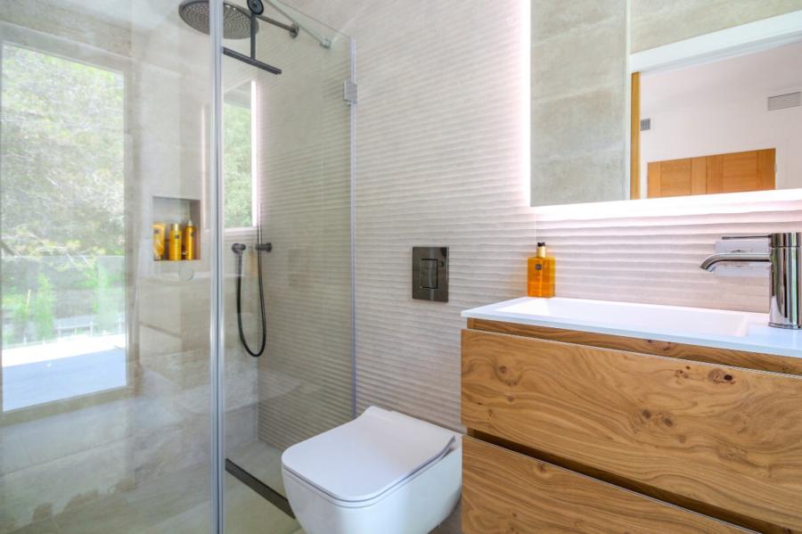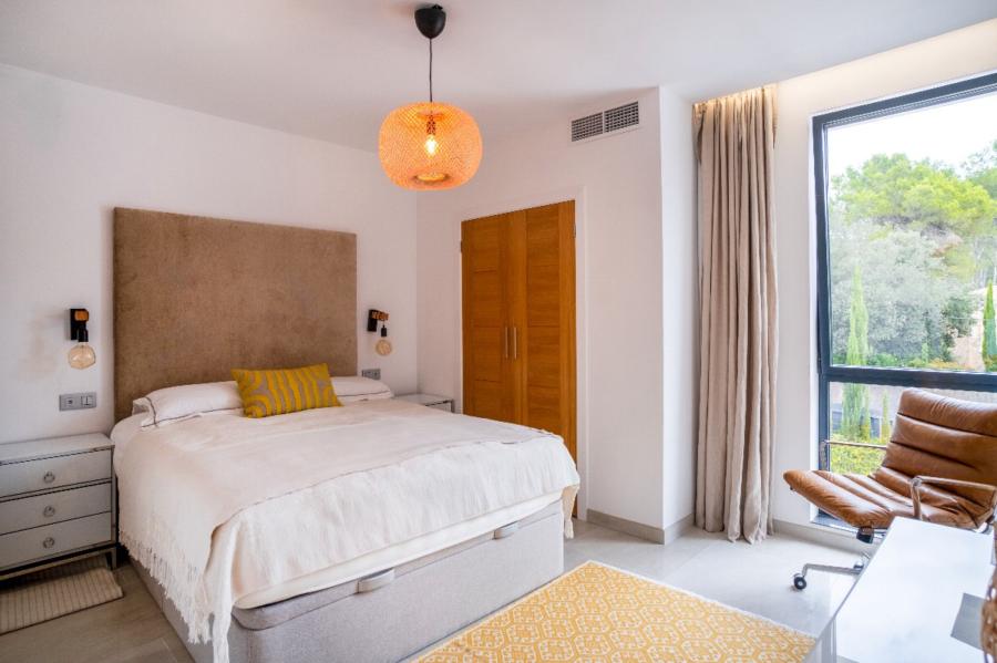 A stunning floating staircase in solid oak leads to the first floor, where a generous landing gives access to three double bedrooms, all with en-suite bathrooms. The master bedroom impresses with its size and includes a spectacular dressing room and a designer bathroom with a freestanding bathtub. The other two bedrooms share a spacious terrace with views of the pool, gardens, and the majestic Serra de Tramuntana, while solid Mallorquinas shutters provide excellent sun protection for the south and southwest-facing rooms.