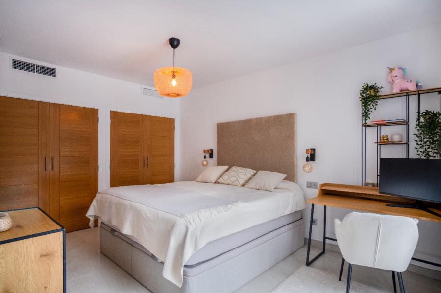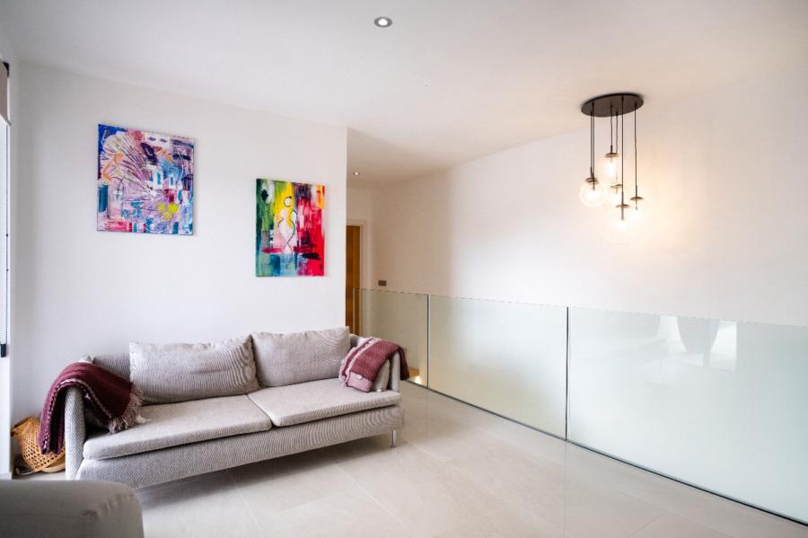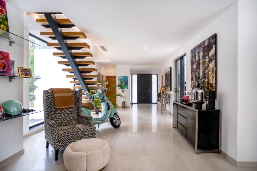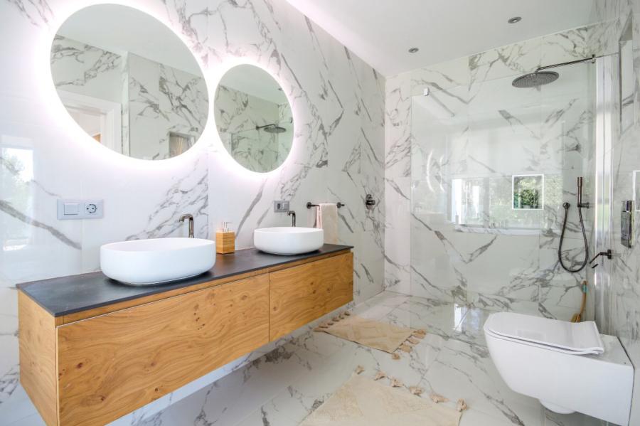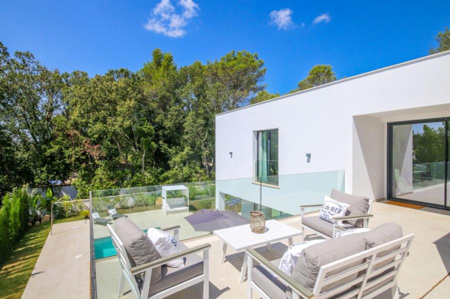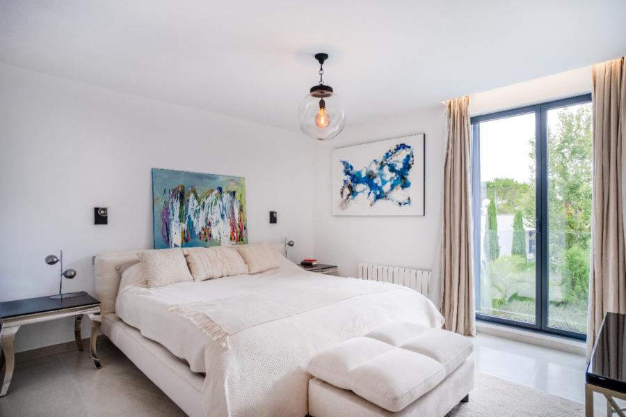 A stunning floating staircase in solid oak leads to the first floor, where a generous landing gives access to three double bedrooms, all with en-suite bathrooms. The master bedroom impresses with its size and includes a spectacular dressing room and a designer bathroom with a freestanding bathtub. The other two bedrooms share a spacious terrace with views of the pool, gardens, and the majestic Serra de Tramuntana, while solid Mallorquinas shutters provide excellent sun protection for the south and southwest-facing rooms.