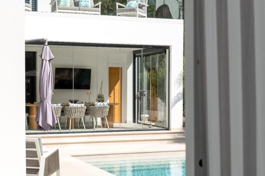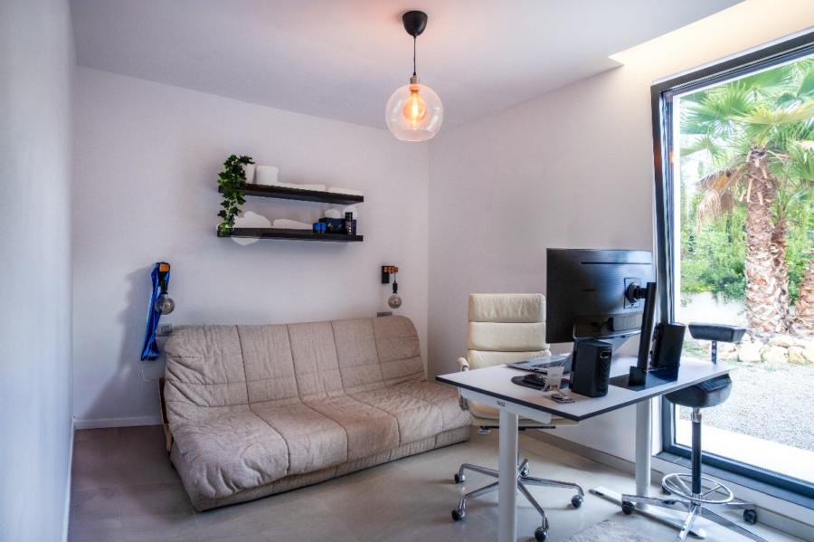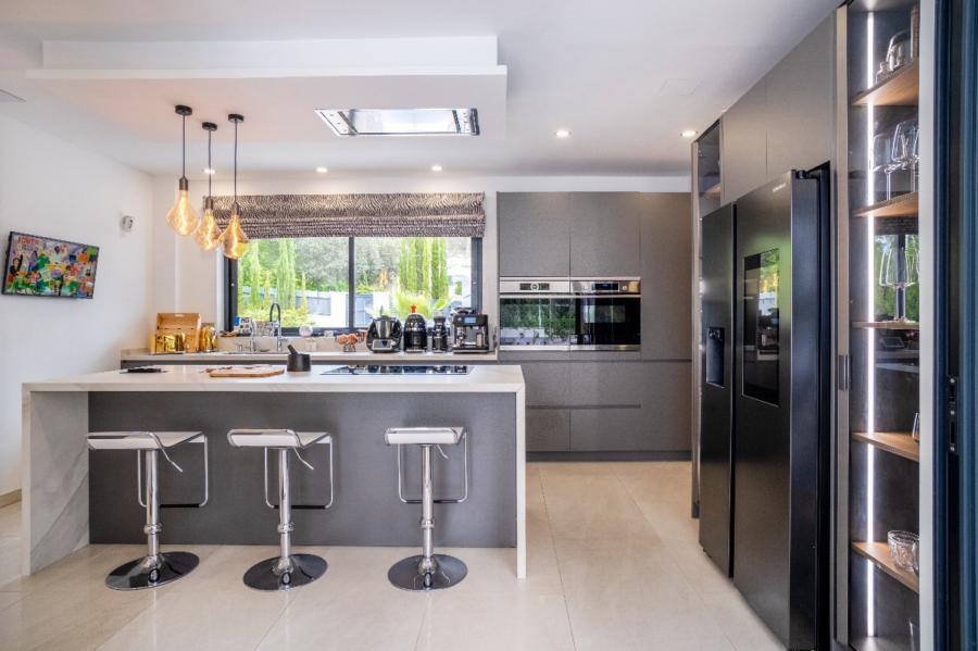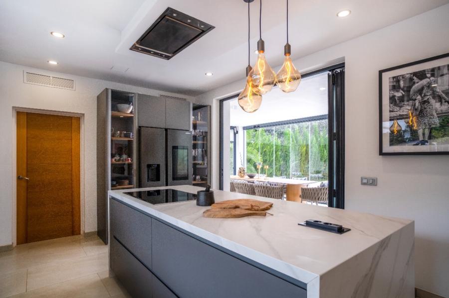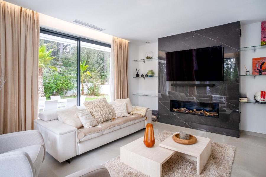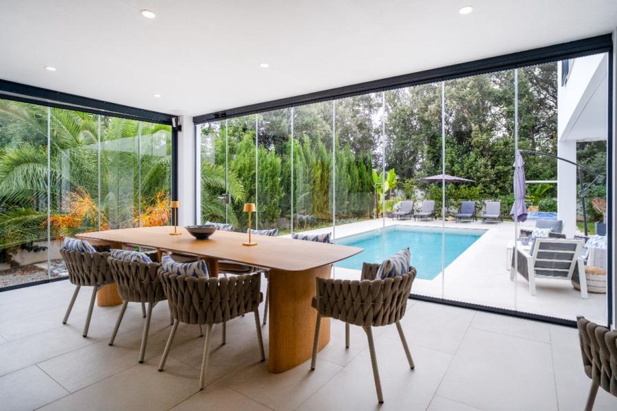 From the kitchen, there is access to the covered porch, designed for year-round enjoyment thanks to its glass enclosure system. This area is set up as an outdoor living room with TV, designer furniture, and a bar with stools, enjoying open views over the landscaped garden with irrigation system, the swimming pool, and the surrounding green areas. Outside, the villa also offers a convenient guest WC.