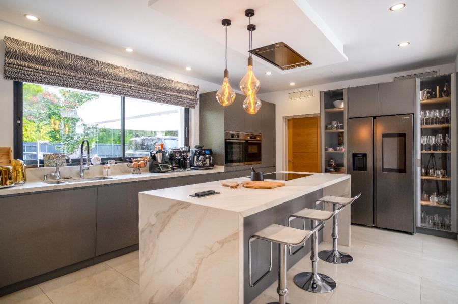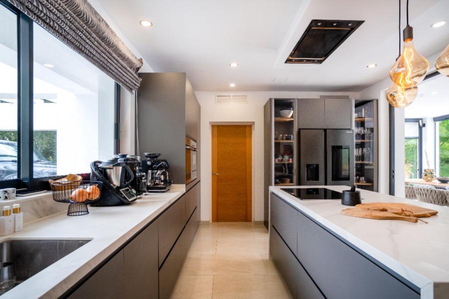 The fully independent kitchen, fitted with top-of-the-range appliances, stands out for its generous central island and exclusive details such as an instant boiling water tap, water filtration system, waste disposal sink, fridge with touch screen, and direct access to a spacious and fully equipped laundry room.